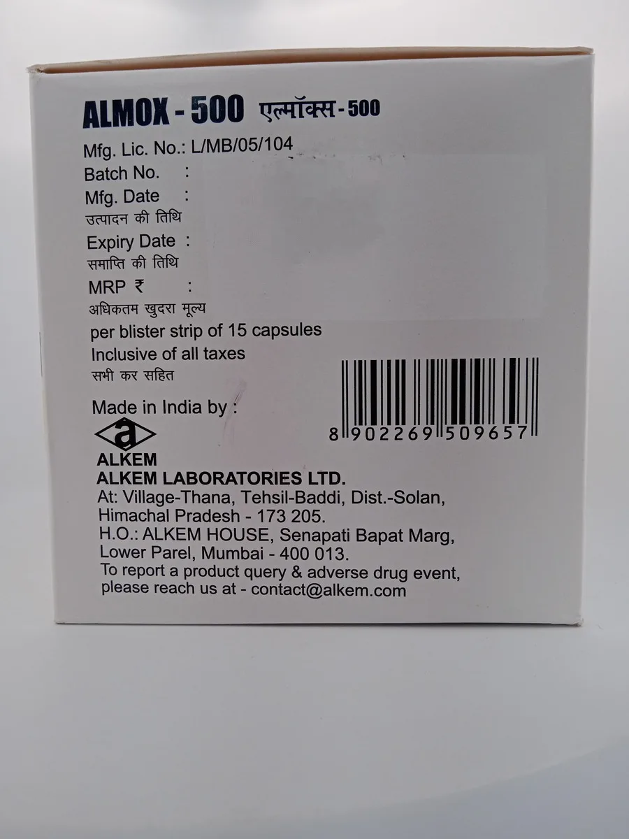 Usage Instructions: Take Almox 500 MG orally as directed by your healthcare provider, usually every 8 or 12 hours. The dosage and duration of treatment depend on the severity of the infection and your response to the medication. Complete the full course of antibiotics, even if you feel better before finishing.