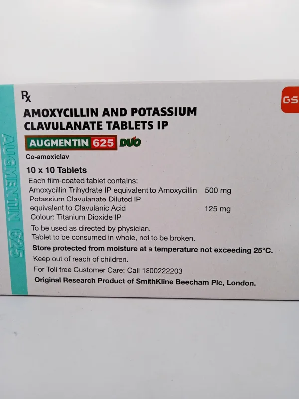 AUGMENTIN 625 MG DUO combines amoxicillin and clavulanic acid in a powerful formulation to fight bacterial infections. Amoxicillin, a broad-spectrum penicillin-type antibiotic, works by inhibiting bacterial cell wall synthesis, while clavulanic acid helps overcome bacterial resistance. This duo provides comprehensive infection control, making AUGMENTIN 625 MG DUO a reliable choice for effective treatment.