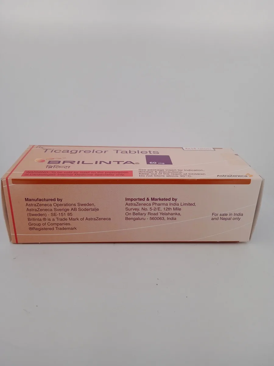 BRILINTA 60 MG, containing Ticagrelor, is a prescription blood thinner designed to reduce the risk of heart attacks and strokes in patients with acute coronary syndrome or a history of heart attack. It works by preventing platelets from sticking together, reducing the likelihood of blood clot formation.
