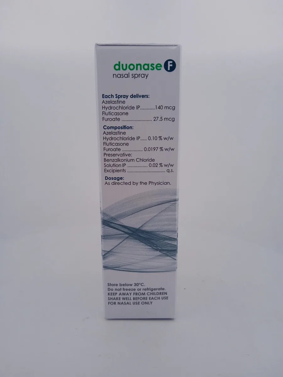 DUONASE F Nasal Spray is a powerful combination treatment designed to alleviate nasal allergy symptoms and sinus congestion. With a dual-action formula of fluticasone propionate and azelastine, this nasal spray provides fast and long-lasting relief from allergy symptoms and improves nasal breathing.