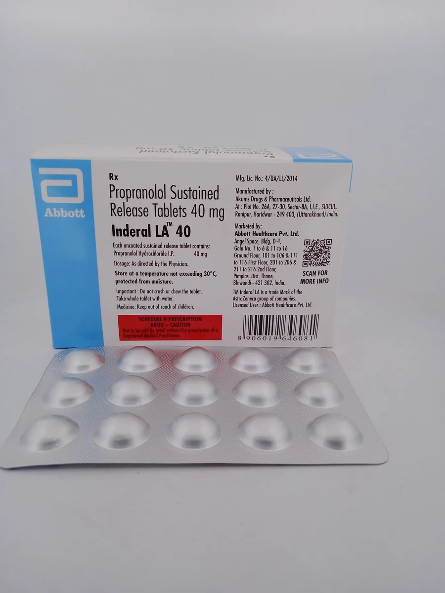 INDERAL LA 40 MG is a long-acting formulation of propranolol, a beta-blocker used to manage high blood pressure, angina, and certain types of irregular heartbeats. It helps improve heart health by reducing strain on the heart.