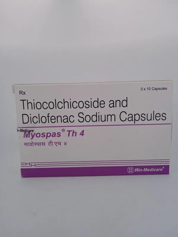 MYOSPAS TH 4 is a muscle relaxant and anti-inflammatory combination, featuring Thiocolchicoside (4mg) and Diclofenac (50mg). It provides fast relief from pain and stiffness due to muscle spasms, making it ideal for conditions like sprains, strains, and sports injuries.